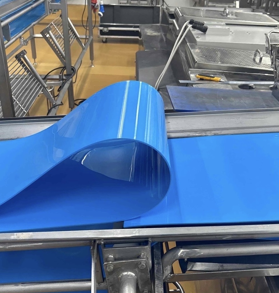 PU Belt (Blue & White) แบบ Homogenous คือสายพานลำเลียงที่ผลิตจาก Polyurethane เนื้อเดียวตลอดทั้งแผ่น ไม่มีชั้นผ้าเสริมภายใน ลดการสะสมของสิ่งสกปรก แบคทีเรีย และความชื้น เหมาะอย่างยิ่งสำหรับอุตสาหกรรมอาหาร เครื่องดื่ม และยา ที่ให้ความสำคัญกับสุขอนามัยและความปลอดภัยสูงสุด